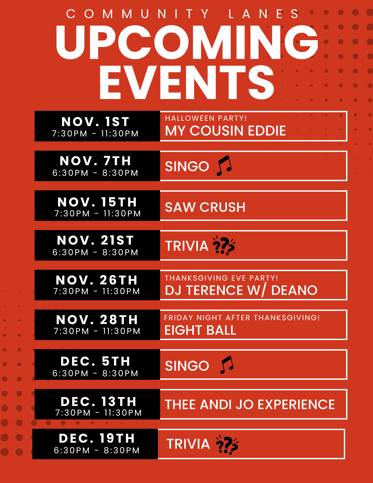 We are also offering this bus if your group would like to spend the entire time having a great time at Community Lanes during one of our awesome events! We offer more than just bowling, great food and ice cold drinks. Check our our Live Entertainment Schedule for Live Music, Trivia & SINGO!